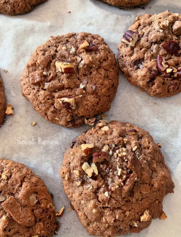 Cette recette a un avantage pour le kwisinier pressé : il n’est pas nécessaire de laisser reposer la pâte. Il suffira de bien espacer les cookies sur la plaque de cuisson et ils s’étaleront bien gentiment.