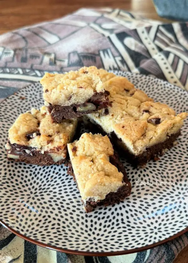 Le brookie c’est le croisement de deux gourmandises indécentes : le brownie et le cookie. L’alliance fusionnelle de deux classiques de la pâtisserie Nord-américaine. Une base de brownie dense au chocolat intense surmontée d’une pâte à cookie bien croustillante. C’est le goûter hyper gourmand. Tu comprends donc pourquoi Sveltesse me regarde de travers quand j’évoque son nom. Comme si le beurre, le sucre et le chocolat d’un cookie ne suffisait pas, viennent s’y ajouter le beurre, le sucre et le chocolat du brownie… et n’oublie pas les noix de pécan!